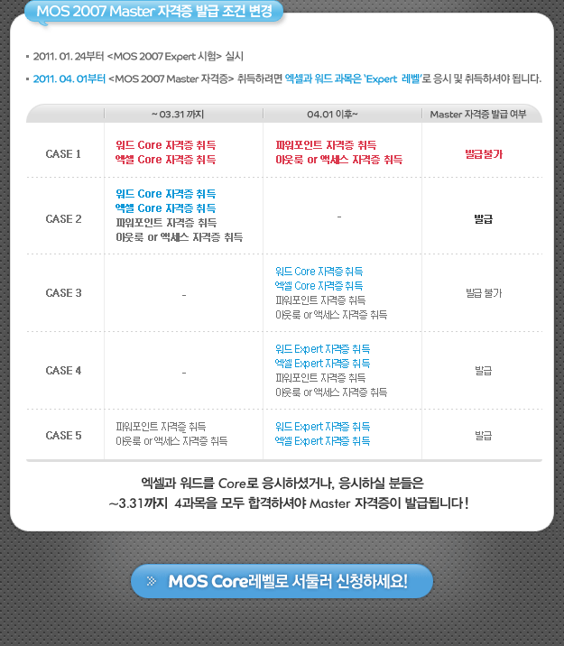 그로인해.. 이번 2월과 3월 개강하는 MOS 자격증반이 Core레벨로(상대적으로 쉽게) Master자격증을 취득하실 수 있는 마지막 개강임을 알려드립니다.